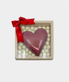 Scrigno di dragées al cioccolato bianco e fondente con cuore artigianale. Un regalo elegante e raffinato, perfetto per ogni occasione speciale.