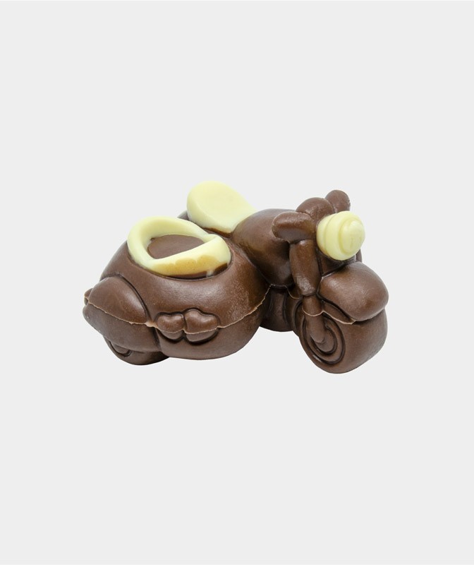 Realizzata con cioccolato al latte e bianco, riproduce una piccola moto dallo stile vintage con cura nei dettagli, rendendola perfetta sia come regalo che come dolce decorativo.