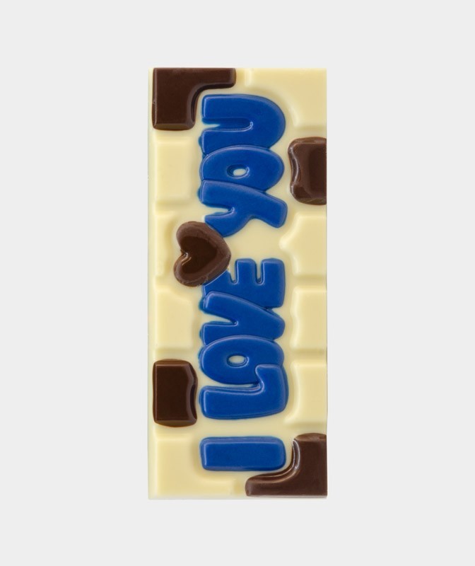 Realizzata in cioccolato bianco con inserti in cioccolato fondente, è curata nei dettagli e pensata per trasformare un messaggio speciale in un momento di dolcezza.