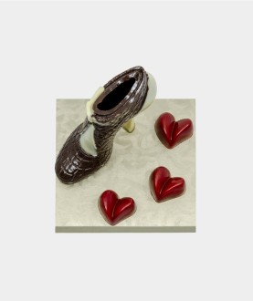 Scarpa con tacco decorata con fiori in cioccolato e pasta di zucchero. Un regalo elegante e originale, perfetto per ogni occasione.