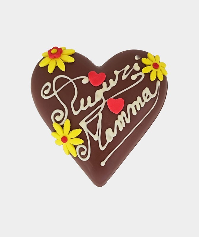 Cuore in cioccolato al latte decorato con fiori e scritta “Auguri Mamma”. Un regalo dolce ed elegante per la Festa della Mamma.