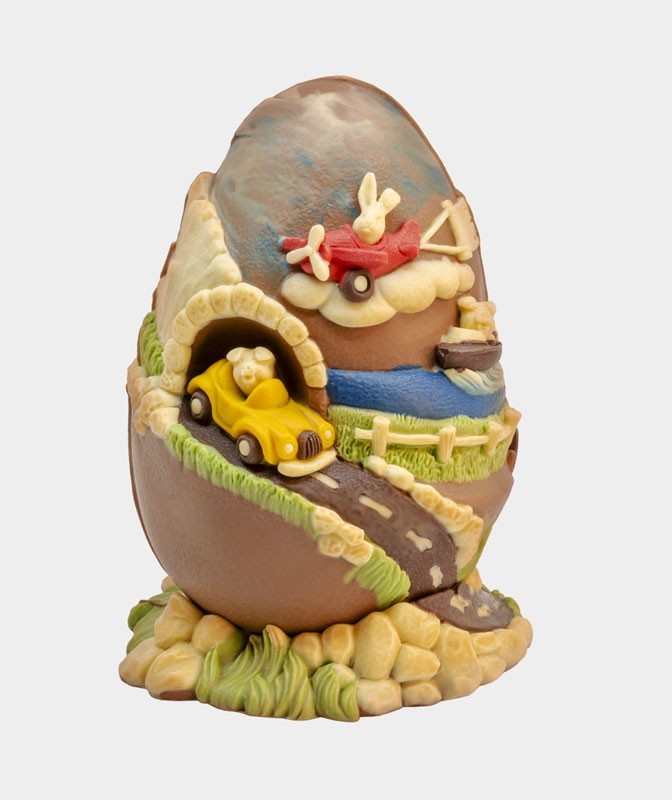 Uovo Pasquale Mezzi di Trasporto - soggetto in cioccolato al latte con dettagli in cioccolato bianco