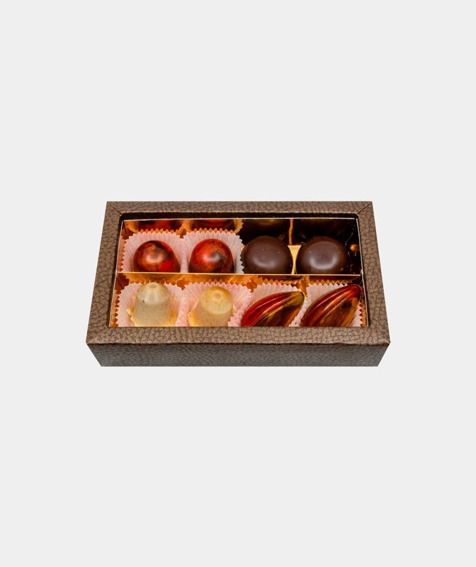 Dolce momento: elegante confezione da 8 praline artigianali in 4 gusti: rhum, caffè, cocco e passion fruit.